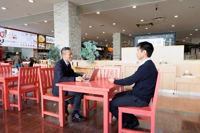 「おのだサンパーク」のフードコートで雑談。同施設には仕事やランチ、買い物でほぼ毎日通っているそう。