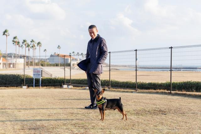 「ソル・ポニエンテ」のドッグランで、愛犬のけん太くんと過ごす井上さん。店舗の敷地内では、海の絶景と潮風を楽しみながら愛犬と散歩できる。