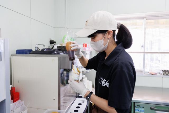 入社当初は、売店での接客や収穫体験の案内係を主にしていましたが、現在は、レストランでソフトクリームやドリンクなどの調理や接客を担当しています。